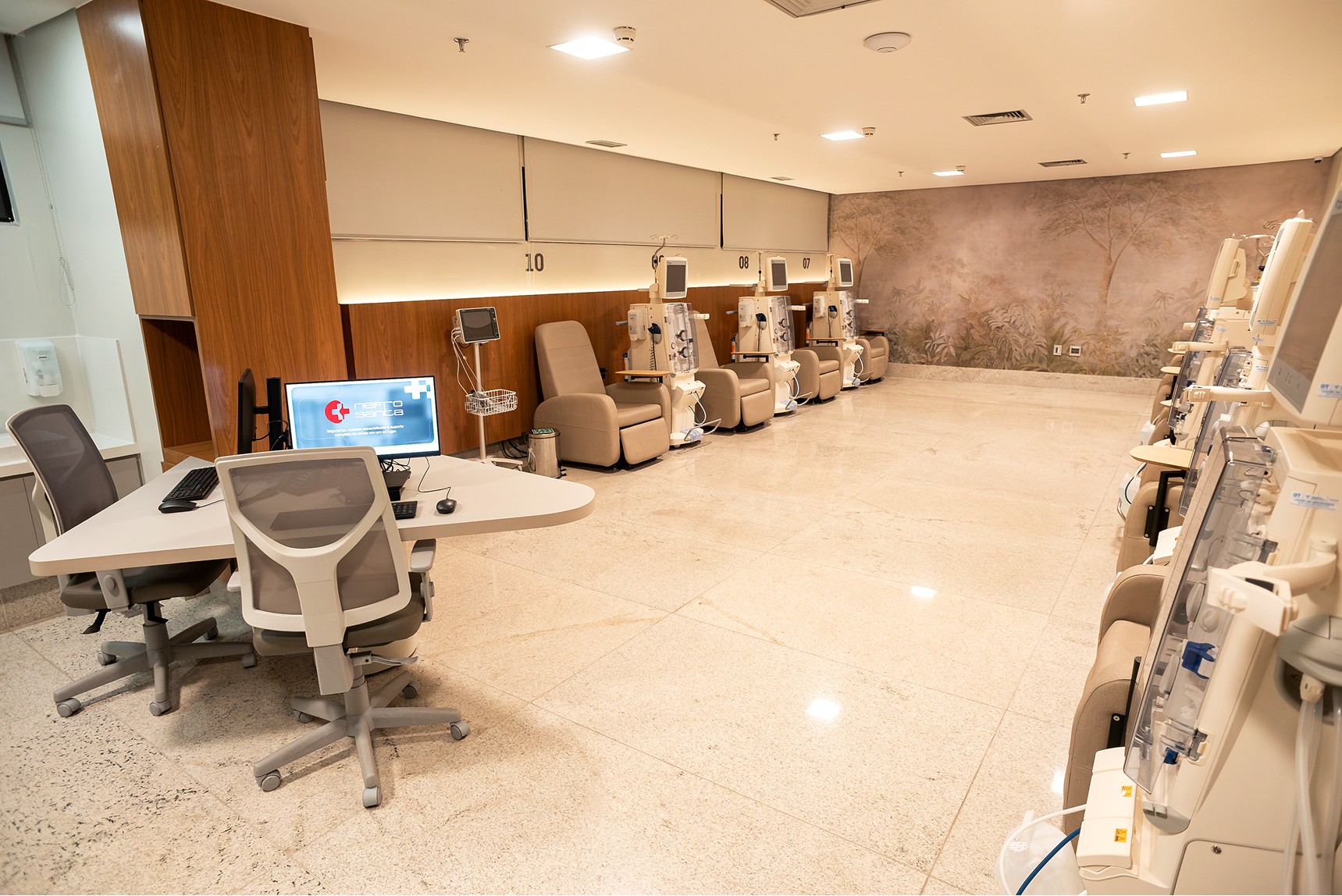12 poltronas de diálise em salas amplas, climatizadas e divididas por perfil assistencial;