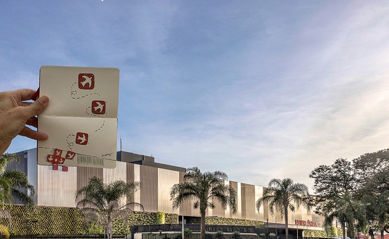 Para esta homenagem, o artista aplicou sua assinatura criativa, a técnica de "Interferência", que dá nome a sua famosa série com desenhos em cadernetas. O processo criativo envolveu ilustrações digitais sobrepostas a fotografias já existentes do Hospital Santa Lúcia, que, vale lembrar, foi o primeiro hospital privado de Brasília. A instituição, fundada em 1963, tem se dedicado a oferecer saúde de alta complexidade com pioneirismo tecnológico e humanização, mantendo-se como uma das marcas mais tradicionais da cidade.