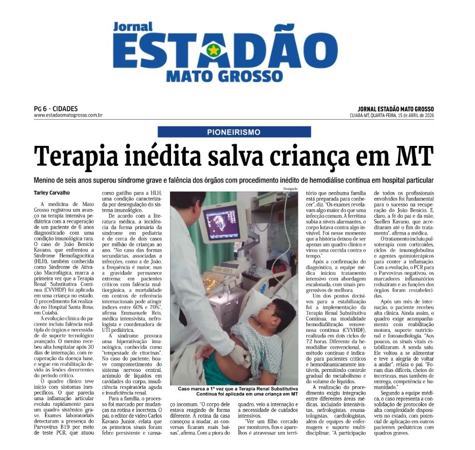 A editoria de 'Cidades', do Jornal Estadão MT, entrevistou a médica nefropediatra e coordenadora da UTIP, do Hospital Santa Rosa, Dra. Emmanuele Reis, para explicar os detalhes do procedimento que salvou o paciente.